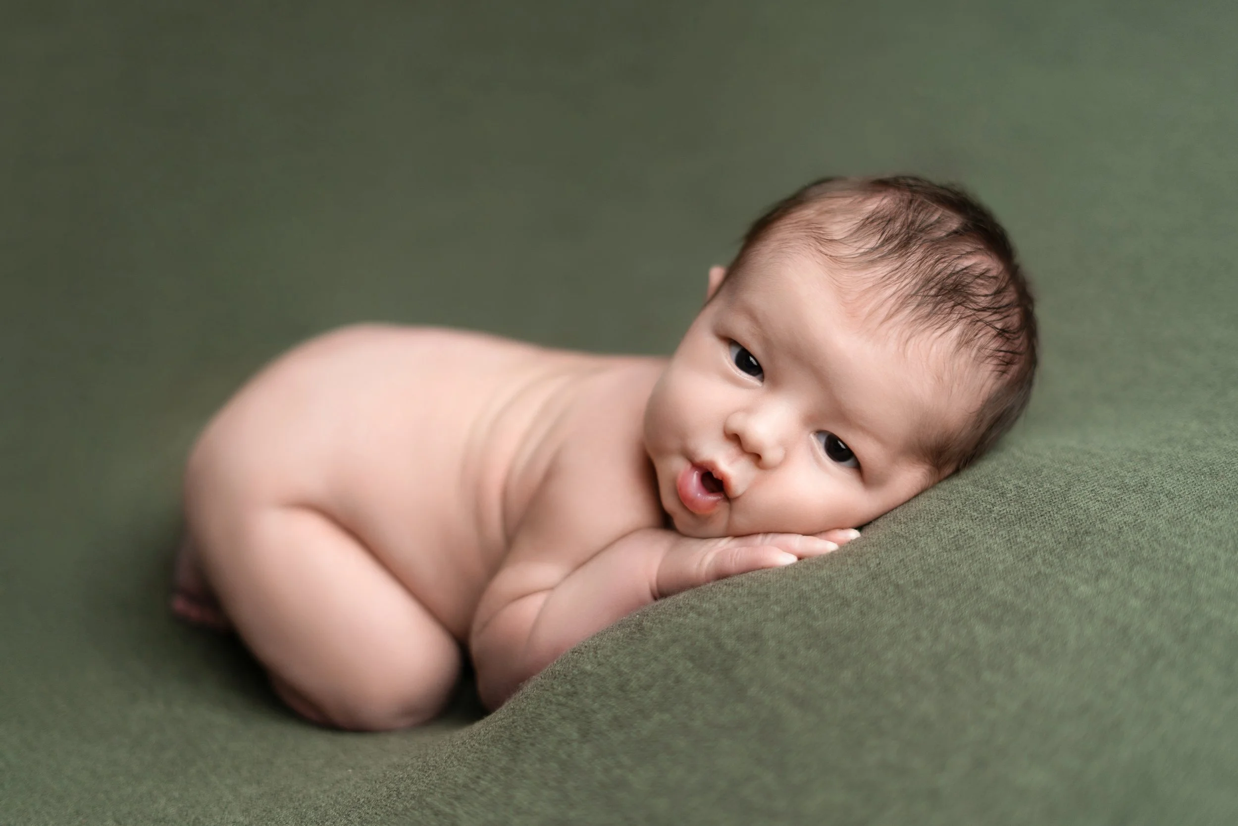 The above image shows that unwrapped, awake babies, can still be posed for their newborn photos. It is also much easier to settle a baby who is wrapped. If your baby is not tolerating their table poses while awake, we will wrap to settle them and then photograph them in their prop sets! 99% of the time, wrapping an unsettled baby will put them right to sleep. But if they’re not asleep, we can still capture those adorable eyes and expressions.